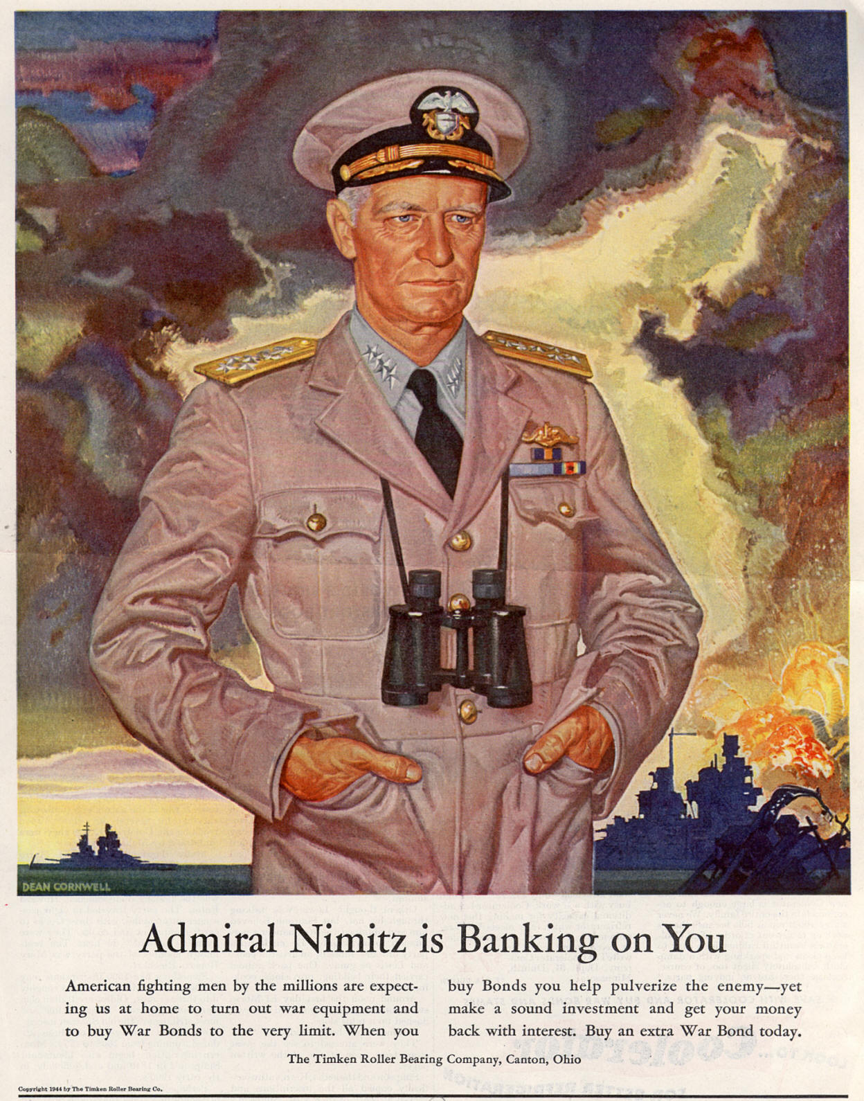 Admiral Nimitz is Banking On You Collection: Ad*Access Company: Timken Roller Bearing Company Product: War Bonds Publication: Saturday Evening Post Publication Type: Magazine Year: 1944 Number of Pages: 1 Subject: War--War Bonds Famous People--Admiral Nimitz Illustration--Painting Artist--Dean Cornwell Military Item Number: W0359 Duke University http://library.duke.edu/digitalcollections/adaccess.W0359/