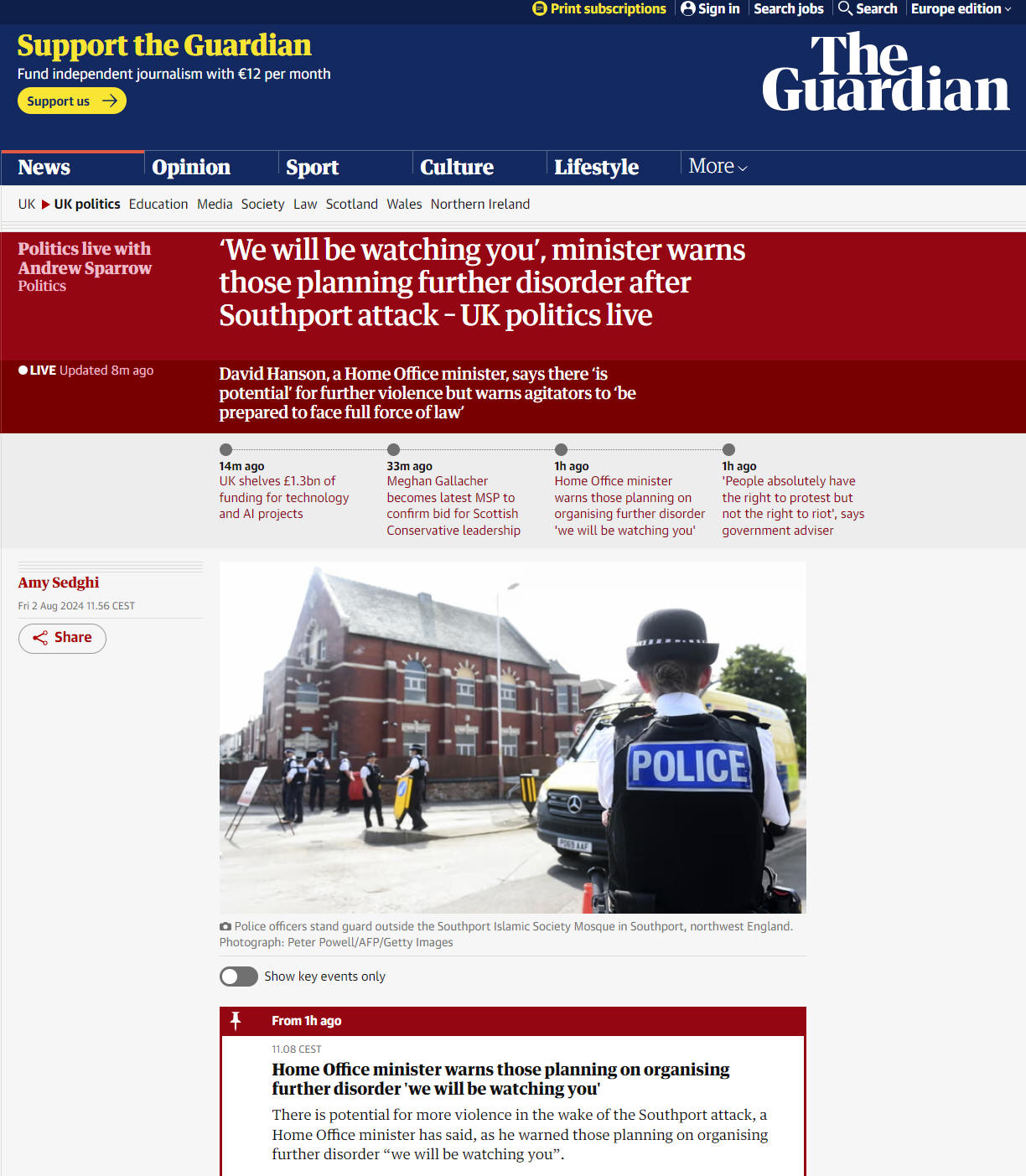 ‘We will be watching you’, minister warns those planning further disorder after Southport attack – UK politics live