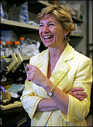 A bookworm since childhood, Susan Desmond-Hellmann says that she coped with job anxiety earlier this year by reading. She pored over the results of old clinical trials of her company's drugs, trying to reassure herself that three important new trials would turn out all right. "I just kept going back and rereading them," said Dr. Desmond-Hellmann, the president for product development at Genentech, the big biotechnology company. "It's important to be data-driven and not too optimistic." Her attention to data has paid off. In the last two months, Genentech has reported remarkable success in all three trials, involving two of its cancer drugs. The successes follow a 17-month period ended late last year in which the company had four new drugs approved by the Food and Drug Administration, a notable hot streak in the drug industry. At a time when many pharmaceutical companies are flailing in their efforts to develop drugs - a major factor in the abrupt resignation on Thursday of Merck's chief executive, Raymond V. Gilmartin - Genentech has become a model of innovation and a leading supplier of cancer drugs. And Genentech executives and outside analysts say much of the credit goes to Dr. Desmond-Hellmann, who runs the company's clinical trials. A cancer specialist by training who is invariably described as smart, friendly, level-headed and attuned to the feelings of patients, she is one of the few women in the uppermost echelons of the pharmaceutical business and on Fortune magazine's list of the 50 most powerful women in business.