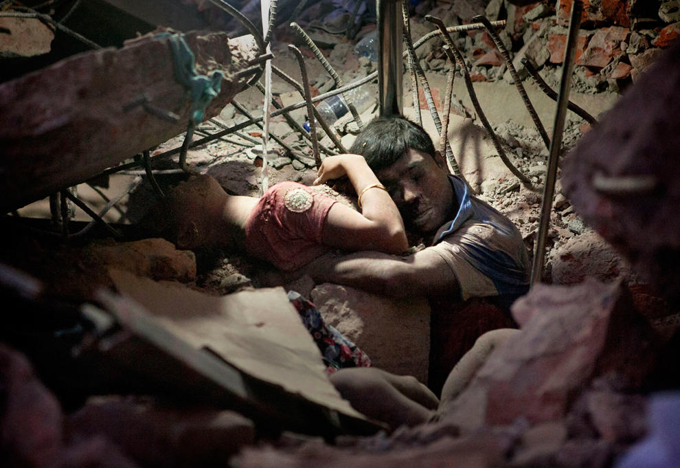 A Bangladeshi man holds on to a woman, both victims of a building collapse, in the debris of Rana Plaza garment factory in Savar near Dhaka, Bangladesh, April 25, 2013.