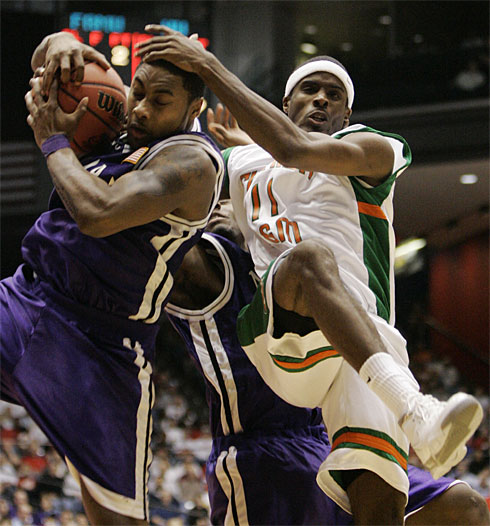 holds on to the rebound as Florida A&M's L.C. Robinson charges in